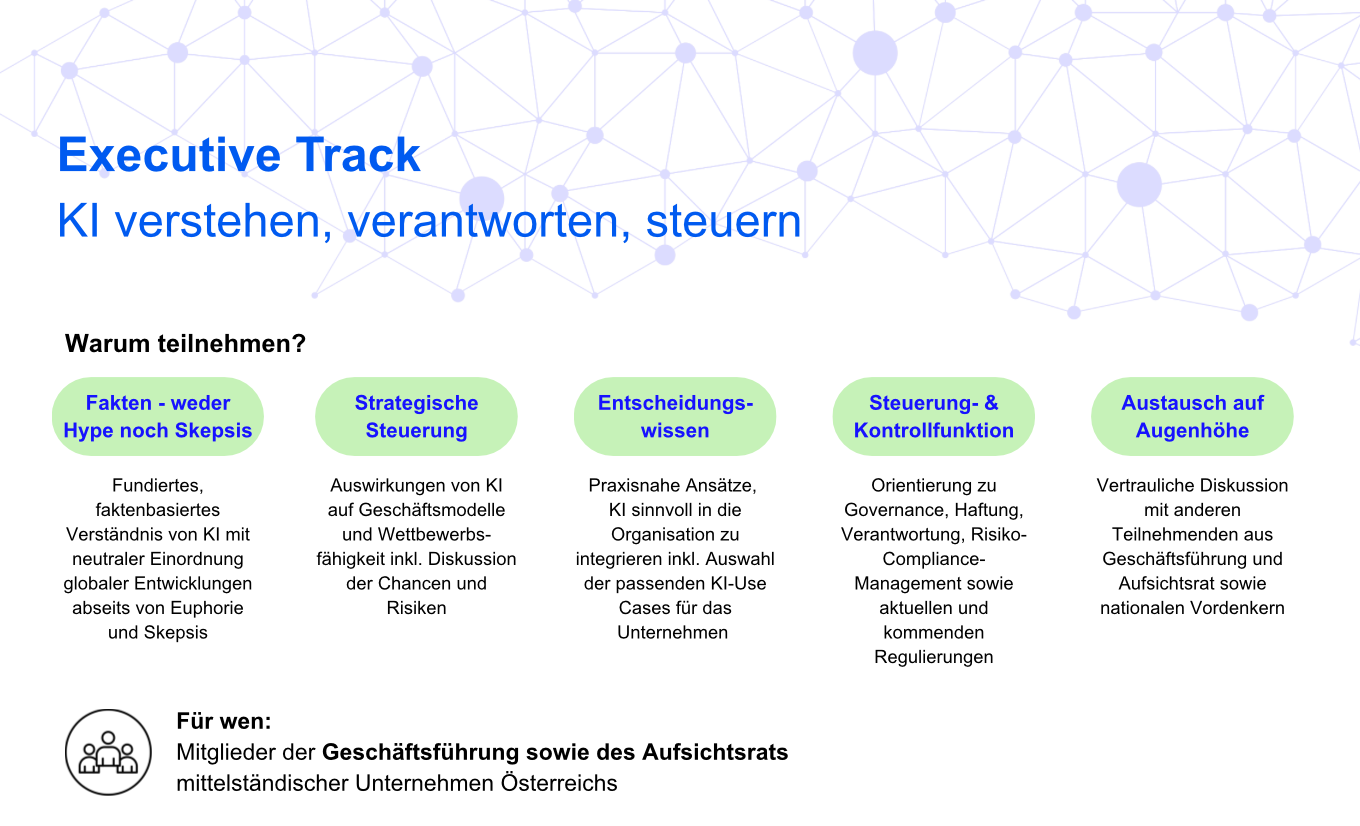 Der Executive Track richtet sich an die Geschäftsführung und den Aufsichtsrat zum Thema KI. Es geht um Fakten statt Hype, die strategische Steuerung von KI im Unternehmen, lehrt notwendiges Entscheidungswissen zu KI und ermöglicht einen Austausch mit anderen Mitgliedern aus Geschäftsführung und Aufsichtsrat auf Augenhöhe. KI verstehen, verantworten und steuern!